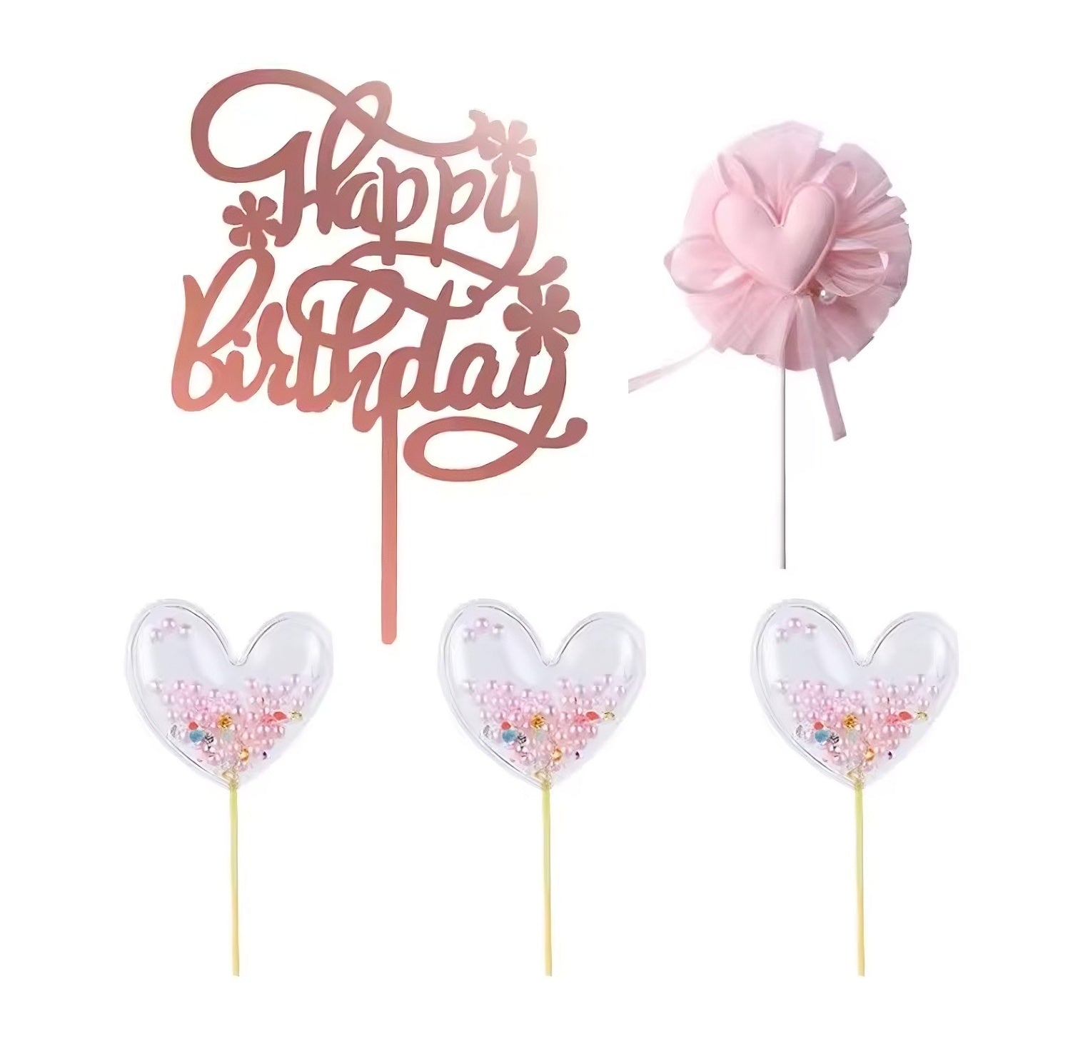 Pink Hearts & Pearls Happy Birthday Cake Topper Set 5PCS